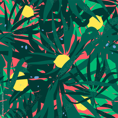 Tropical leaves. Bright decorative seamless texture. Background with palm tree leaf, monstera leaves and lemon tree fruit. Vector pattern.