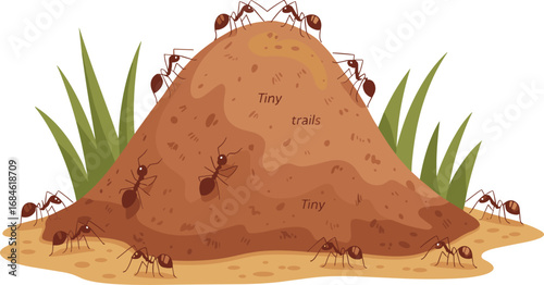 Ants in Action. Flat vector icons of ants as scavengers: ant carrying leaf, ant with bread crumb, trail of food transport, ant