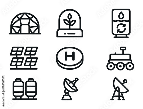 Six black outline icons depicting space exploration and future living, including a geodesic dome, planetary rover, solar panel, flag, satellite dish, and supply crate on white