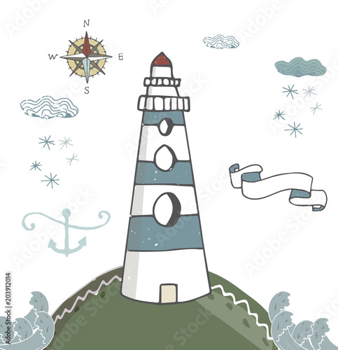 Lighthouse blue ribbon anchor kompas lighthouse white beacon, windows pharos, screed, seamark snowflake snow cloud landscape waves vector card on white background