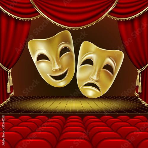 Theater masks. Masquerade vector icons. Comic and tragic mask icons. Happy and unhappy traditional symbol of theater. Funny and sad theater masks. Vector Illustration