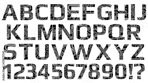 Set of latin digital alphabet perforated with PCB circuit board tracks isolated on white. Black capital letters silhouettes for modern digital world. Design element.