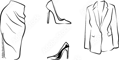 Fashion set design featuring pencil skirt, high heels, and blazer line art illustration