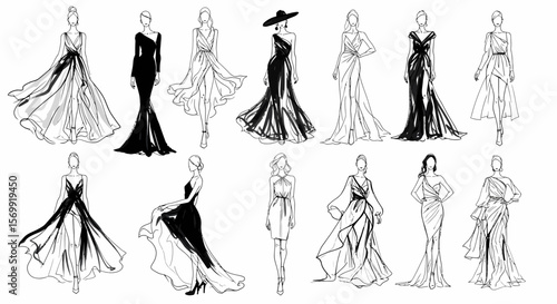 Silhouette illustration of confident women in pencil dresses, various poses, fashion female figures on white background, elegant style for creative vector use