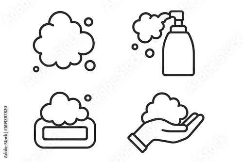 Collection of foam and soap line icons. Hand washing and hygiene concept. Bubbles, lather, suds. Vector outline signs for sanitizer dispenser, clean hands, personal care.