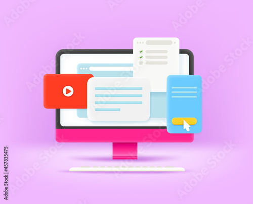 Working male character employee in office standing with computer typing on keyboard communicating. Man freelancer stay at home with laptop. Young clerk with tablet pc serfing internet in workspace