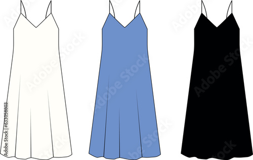 Vector drawing of a dress on thin straps made of white and black silk. Outline template of an evening long women's dress. Sketch of a women's combination on the straps front and back view.