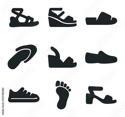 Summer Footwear Icons. Solid, filled icons set of summer footwear trends: strappy sandals, espadrilles,