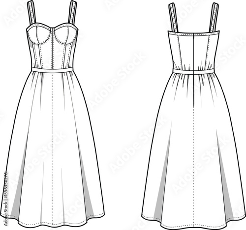 Fit-and-flare strappy dress front and back, cad drawing flat vector illustration, technical fashion sketch, structured bodice design, flared hem silhouette
