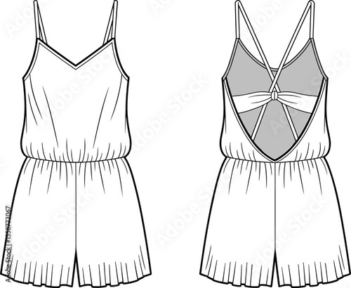 Women's Strappy Playsuit Fashion Flat Sketch Vector Illustration, CAD, Technical Drawing, Flat Drawing, Template, Mockup.