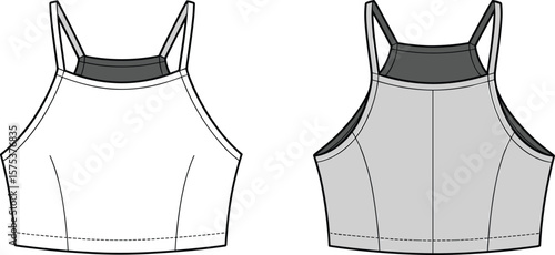 Stylish women's crop top, strappy racerback design, technical fashion flat, front and back view, vector drawing, editable clothing illustration