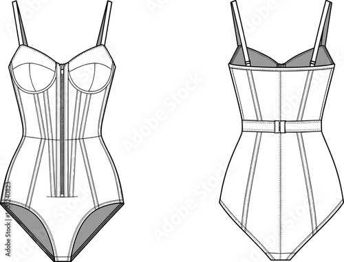 Fashion bodysuit CAD drawing flat sketch, front and back view with strappy back design, detailed apparel vector illustration template