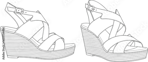 Collection of four distinct wedge sandal styles with simple line drawings for fashion design