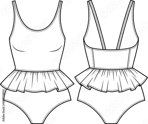 One-piece swimsuit fashion flat, front and back views, strappy design, women’s swimwear template, technical drawing, vector fashion sketch