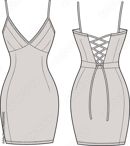 PrinBodycon dress fashion technical sketch, front and back view, strappy lace-up detail, women's garment design, fitted elegant dressBodycon dress fashion technical sketch