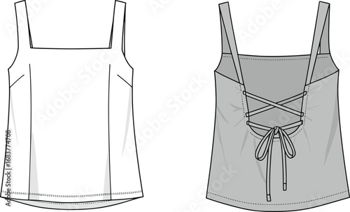 Women’s camisole top vector template, sleeveless tank fashion flat sketch, strappy summer shirt design, front and back clothing illustration
