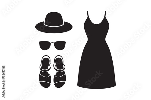 Summer Party Outfits Icons. Outline icon set of summer evening party outfits: sequin dress, strappy heels,