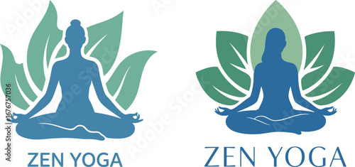 Set of Zen Yoga logos with a woman meditating in the lotus position surrounded by leaves, perfect for a yoga studio