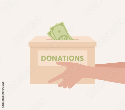 Hands holding donation box with green leaves receiving coins and paper money for charity support and financial aid giving concept flat vector illustration