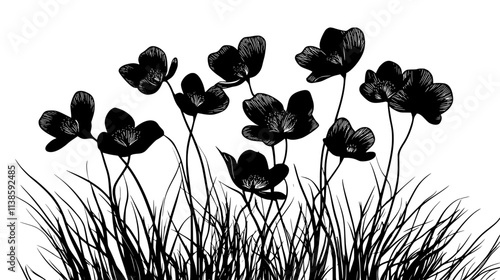Pasqueflower blooms emerging from furry buds on tundra, Vectorized Plant Art
