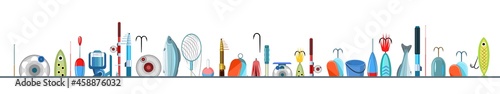Fishing accessories. Including fish. A variety of items complete set. Isolated on white background. Bottom border. Vector