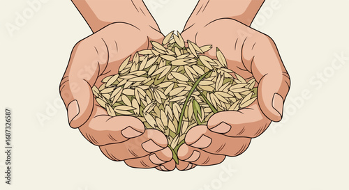 Design template for agriculture or farming. Layout or flyer with farmer hands holding ripe grains of wheat. Agricultural produce. Harvest season in farm land. Handful of cereal vector illustration