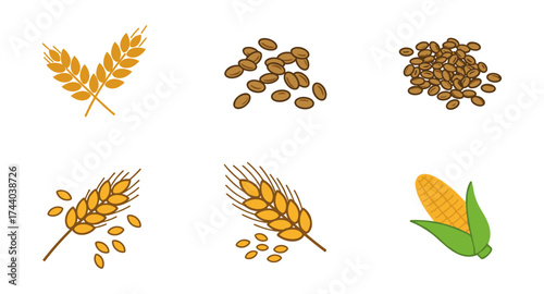 Minimalist Flat Vector of Harvested Wheat, Rice Stalks, and Rye Cereal Grains