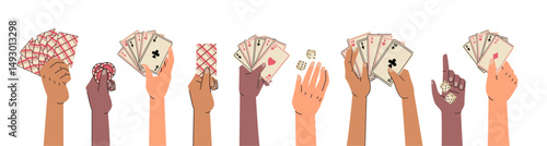 Playing Cards And Hand Silhouette Set. Vintage Poker And Gambling Theme Isolated Vector Illustration Collection