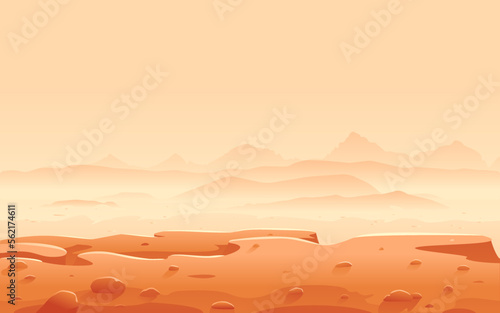 Red planet Martian landscape background. Vector cartoon illustration of Mars surface with mountains, valley, and crater. Concept for space exploration, sci-fi, futuristic travel.