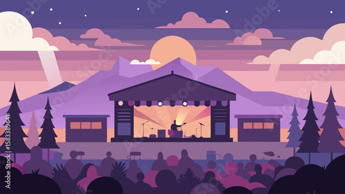 Outdoor jazz concert under the midnight sun at a Finnish festival in Lapland with mountains and forest backdrop