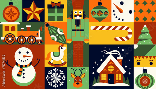 Mosaic geometric winter background with nutcracker. Collection of Christmas holidays. Happy New Year and Christmas!