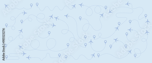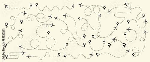 Airplane line path icon with start point. Airplane dashed lines path with start point and dash line trace vector set.