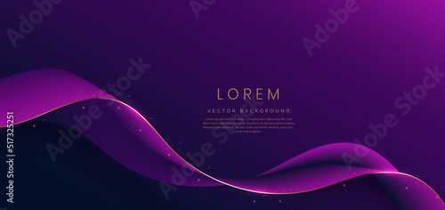 Abstract 3d gold curved purple ribbon on purple and dark blue background with lighting effect and sparkle with copy space for text. Luxury design style.