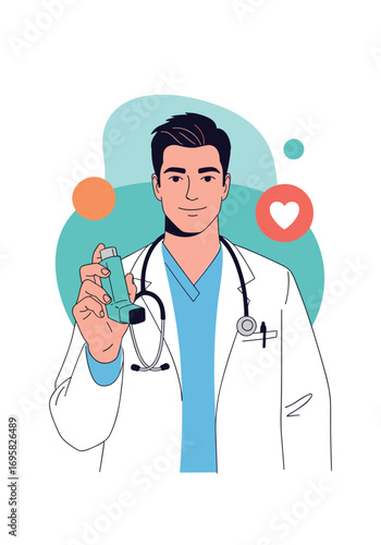 Man uses an asthma inhaler against attack. World asthma day. Allergy,Bronchial asthma. Vector  illustration