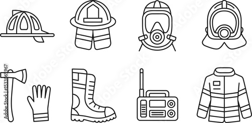 Firefighting emergency icons set with safety equipment tools rescue symbols fire truck hydrant alarm hose firefighter gear evacuation protection elements outline