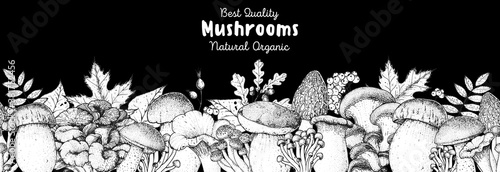 Forest mushrooms background. Edible mushrooms banner. Fungi, healthy food, vegan product sketches. Autumn hand-drawn vector illustration. Engraved design template, card, print, packaging