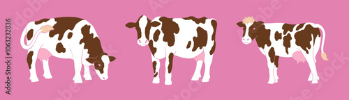 Vector illustration of bull, cow and calf. Farm animals family, adult and young.