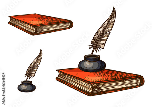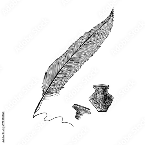 Feather quill pen with ink and inkwell illustration