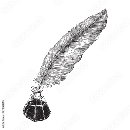 Vintage fountain pen inkwell and feather illustration