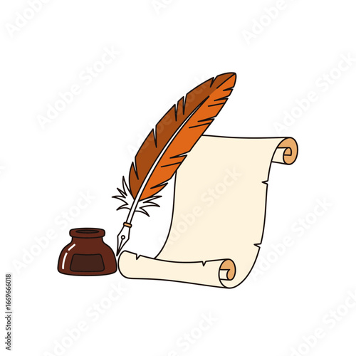 Paper scroll of parchment with feather and inkwell