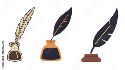 Collection of feather and inkwell vector icons. Nib and inkstand. Classic vintage pen. Vector