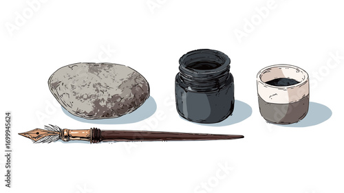 Vintage quill pen inkwell and writing tools illustration
