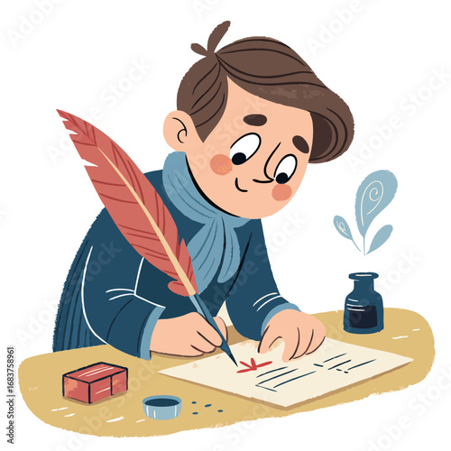 A person, faceless, in blue writes on paper with a pen, desk has inkwell and block
