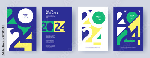 2024 colorful set of Happy New Year posters. Abstract design typography logo 2024 for vector celebration and season decoration, backgrounds, branding, banner, cover, card and or social media template.