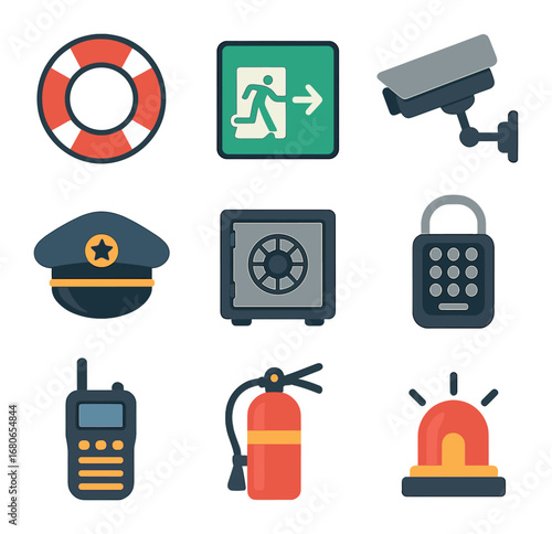 Cruise Security Icons. Flat icon set of premium cruise security: lifebuoy, emergency exit, CCTV, guard hat,