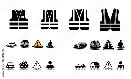 flat black solid icon 8 different items each item inside solid rounded rectangle safety placard no shadows no gradients mask nose guard hazard broken mask nose guard warning mask nose guard