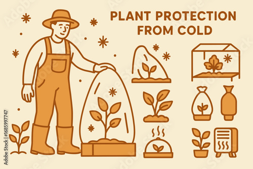 Gardener's Plant Protection. Vector layout featuring gardener protecting plants from cold and plant protection icon set for covers