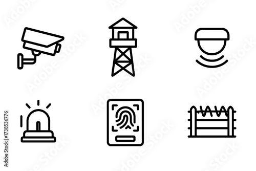 Missile Silo Security Icons. Outline icon set of missile silo security: surveillance camera, guard tower, security gate, motion sensor, alarm system, biometric