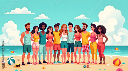 illustration captures the essence of a joyful summer day at the beach, featuring a diverse group of friends basking in the warm sun. The scene is filled with elements that evoke a sense of relaxation