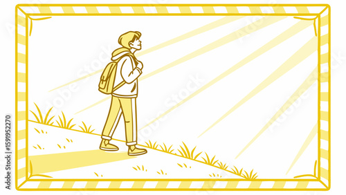Vector Person walks along grassy path, basking in warm sunlight, evoking sense of adventure and freedom